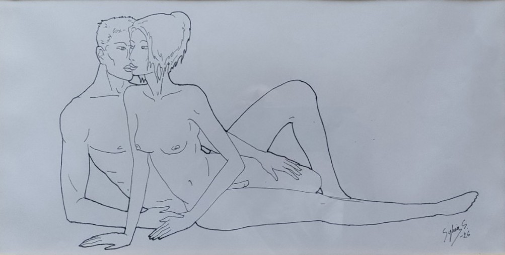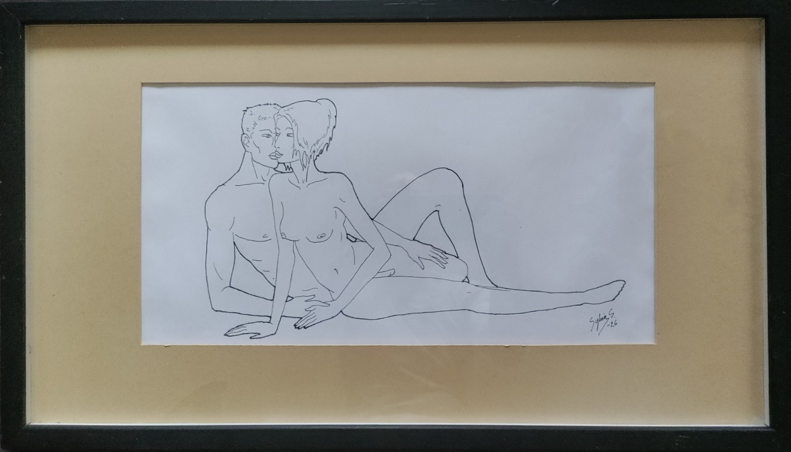 Original illustration/ink drawing for the comic "Sylvia`s secrets". The style is elegant and simple linedrawing, with little japanese influence. Size 62x35cm with glass and wooden frame.